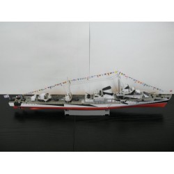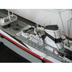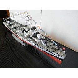 История создания проекта восходит к началу тридцатых годов, когда перед советскими конструкторами поставили задачу: создать эсминец, превосходящий зарубежные аналоги по вооружению и скорости при сравнительно небольшом водоизмещении. В окончательном варианте эсминец имел стандартное водоизмещение 1548 т, и полное - 2111 т. Чтобы обеспечить достаточно высокую скорость - 38 узлов - корпусу корабля придали стремительные обводы с необычайно большим отношением длины к ширине: более чем 10:1. Эсминец - один из тринадцати тихоокеанских , названия которых в отличие от названий эсминцев других флотов, начинались с буквы Р. Его заложили в г. Николаеве в 1936 году под названием . Затем разобрали и перевезли по железной дороге на Дальний Восток и в июне 1939 года спустили на воду год названием . Вступил в строй он лишь в октябре 1941-го. И сразу же на началась напряженная подготовка к будущим боям: учебные походы, противолодочные атаки, стрельбы. Тогда, первой военной осенью, экипаж корабля еще не знал, что ему предстоит сражаться на Крайнем Севере... За годы войны не раз приходилось вступать в единоборство с вражескими подлодками. На боевом счету имеются минимум две потопленные вражеские субмарины. Одна из них была уничтожена в середине ноября 1943 года, а другая - 8 декабря 1944 года - также серией глубинных бомб. Модель имеет чёрно-белый, ломаный камуфляж. Окраска соответствует советскому Северному флоту. Из особенностей модели хочется отметить отличную деталировку. Винты напечатаны бронзовой краской.