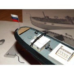 Проект разрабатывался в начале 1900-х для проводки барж по Мариинской водной системе. Это был небольшой паровой винтовой буксир - хорошо приспо-собленный для работы на узких и весьма мелководных фарватерах каналов, достаточно мореходный, чтобы выдержать переход по Финскому заливу, Ладожскому и Онежскому озерам, способный работать и на угле, и на дровах, проходить под мостами, недорогого, неприхотливого, простого в постройке и обслуживании - «незаметного трудяги»... Таких буксиров были построены многие десятки. Они работали и на путях Мариинской системы, и в торговом порту Петербурга, и на судостроительных заводах, и в массе других мест - для них было несложно найти работу. Они считались достаточно надежными и постоянными источниками дохода. Ими интересовались самые разнообразные судовладельцы - от физических лиц, желающих вложить свои сбережения в «верное» дело, до достаточно крупных судоходных компаний. Буксир, представленный на предлагаемых чертежах, был построен в 1908 г. Невским судостроительным и механическим заводом для известной петербургской судоходной компании: Товарищества судоходства и пароходства «И.И. Конецкий». Иван Иванович Конецкий - купец первой гильдии, уроженец Ар-хангельска. Основал товарищество пароходства и судоходства «И.И. Конецкий» в Санкт-Петербурге. Владелец компании «Невское баржное пароходство». Сыновья – Евгений Иванович и Иван Иванович руководили семейным делом после смерти отца. Дочь – Юлия Ивановна состояла в браке с известным рижским инженером Михаилом Эйзенштейном, их сын – Сергей Михайлович Эйзенштейн, кинорежиссёр, классик советского и мирового кино. Племянник И.И. Конецкого Иван Григорьевич Конецкий - купец 1 гильдии, потомственный почетный гражданин. После смерти основателя Товарищества судоходства и пароходства «И.И. Конецкий» Иван Григорьевич с 1905 года стал в нем Директором правления. Помимо этого, Иван Григорьевич был также директором правления Русского Общества для изготовления снарядов и военных припасов (с 1916 г.), председателем правления Петроградского Общества взаимного кредита (с 1913 г.), членом ревизионной комиссии Русского Торгово-Промышленного банка. Умер 31 декабря 1934 года во Франции, в Булони. У Ивана Григорьевича были сыновья Евгений и Иван Ивановичи, которые принимали активное участие коммерческих делах отца. Кстати, из Товарищества С и П «И.И. Конецкий» впоследствии отпочковались и были организованы ряд ведущих заводов Питера и Ижоры - в свете государственной Программы 1910 года по реформированию Флота.