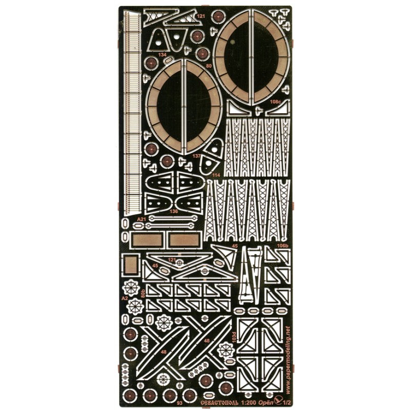 Содержит 2 пластины (145 мм х 63 мм, толщина 0,16 мм) с деталями, которые труднее всего вырезать из картона. Для их использования детали нужно аккуратно отделить от пластины. Фототравление поможет вам значительно усилить эффект от модели и придаст ей гораздо более реалистичный вид.